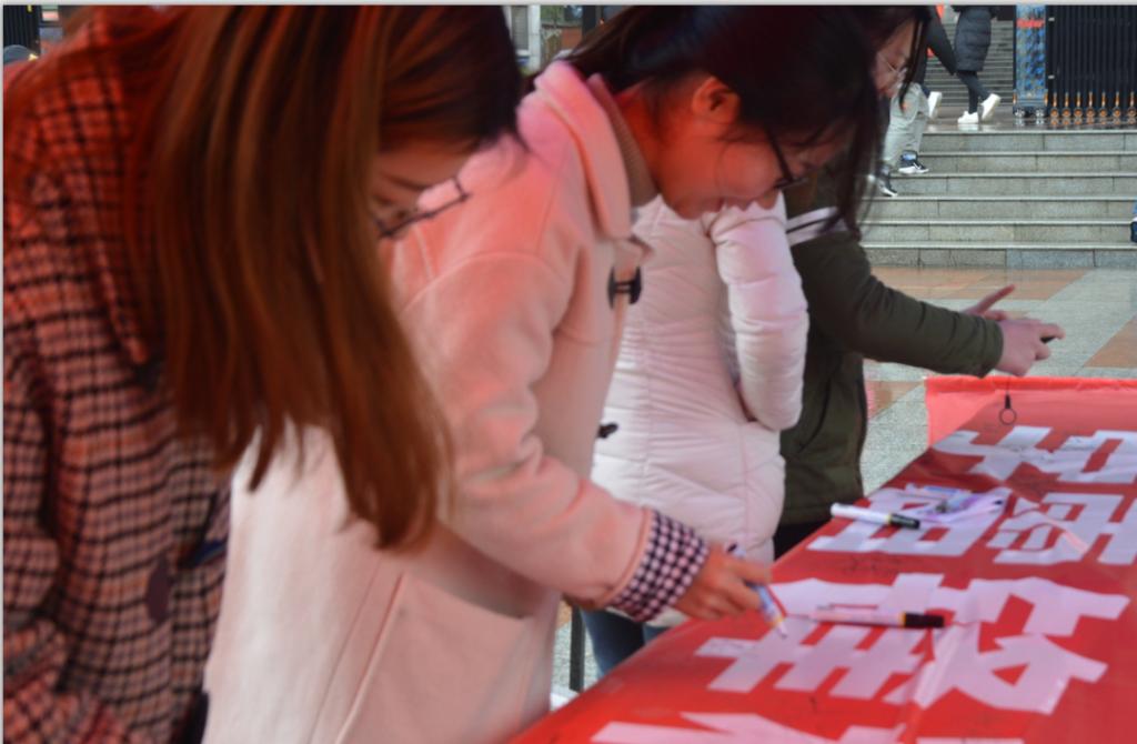 东校区13教门前的志愿签名活动也吸引了不少师生的驻足。在印有“弘扬雷锋精神,传递爱心力量”的红色横幅上,同学们纷纷签上了自己的名字,争做志愿精神的传播者、践行者。签名台的一侧,还展出着学校志愿活动风采展展板,展板通过照片墙的形式再现了我校“阳光号列车”、“天使之家”、“爱心家园”等公益社团参加“老年大学英语支教”、“新风小学支教”、“关爱自闭症儿童”等志愿服务活动的生动情形。