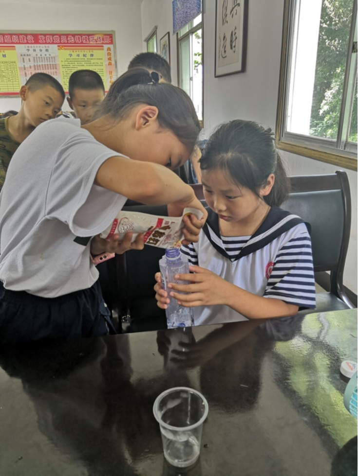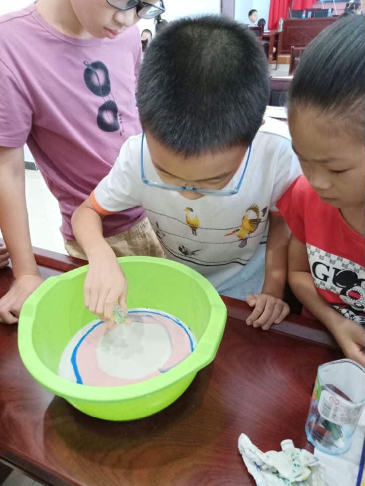 志愿者梁淑仪在街河市镇开展化学小实验—牛奶彩虹小实验,志愿者杨涛、李平在刘家镇开展了火山喷发的小实验。