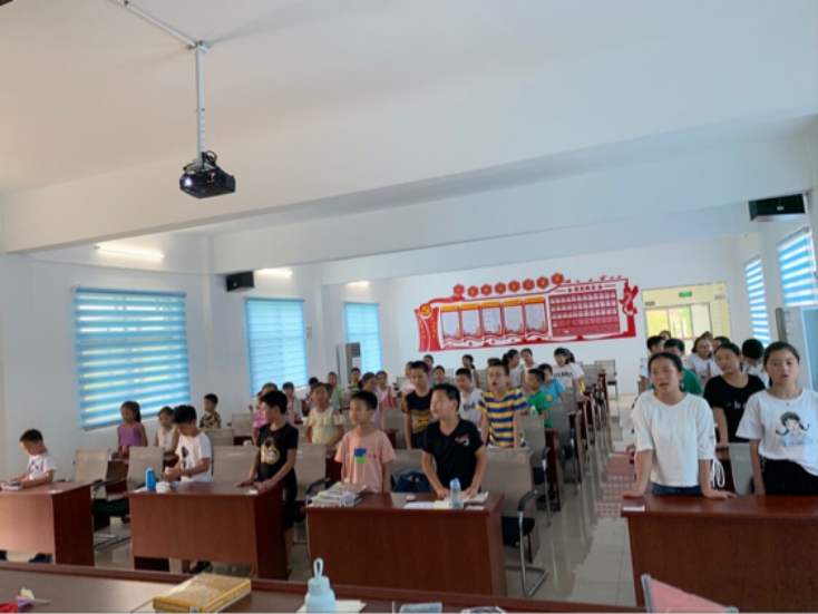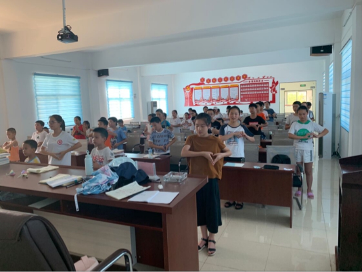 洈水镇志愿者教同学们学唱《团结就是力量》以及《感恩的心》的手语舞。