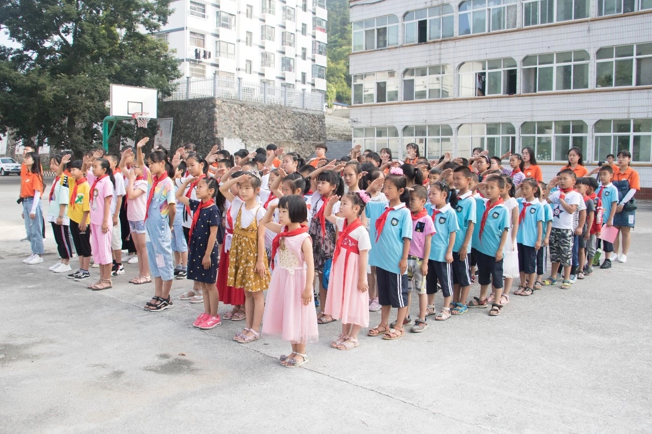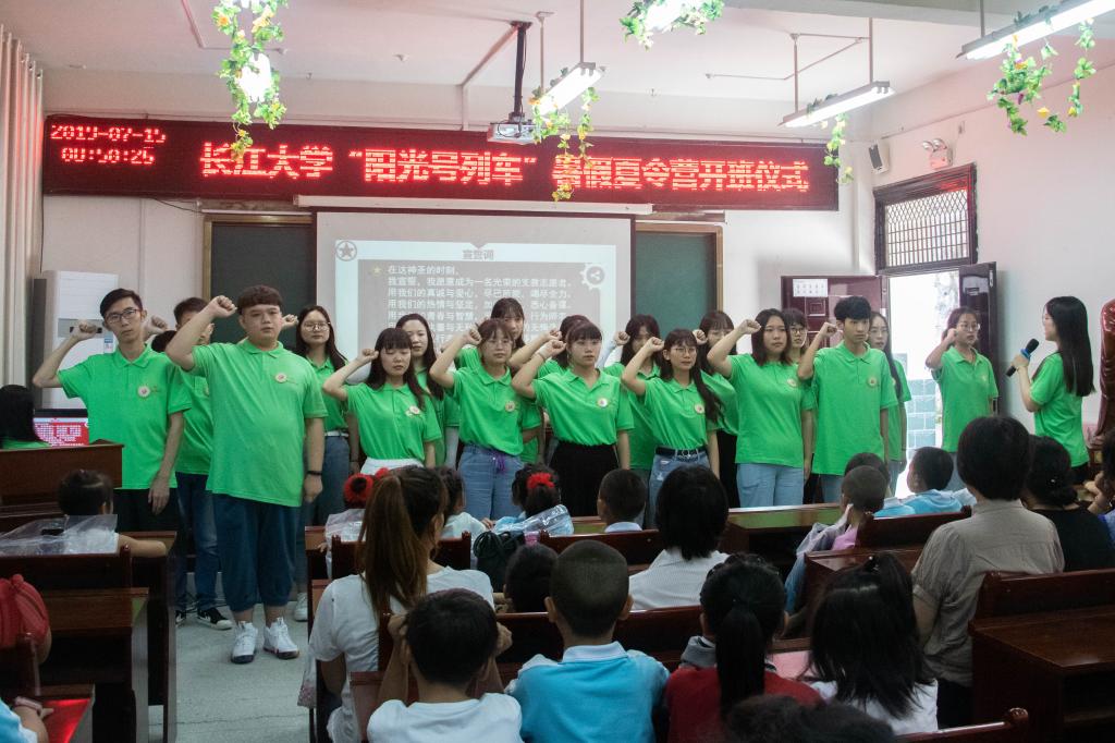 7月15日上午,在水月寺镇中心学校综合活动室举行了“阳光号列车”2019年暑期夏令营活动开学典礼,20名支教志愿者以及100余名学生和家长参加开学典礼的活动。