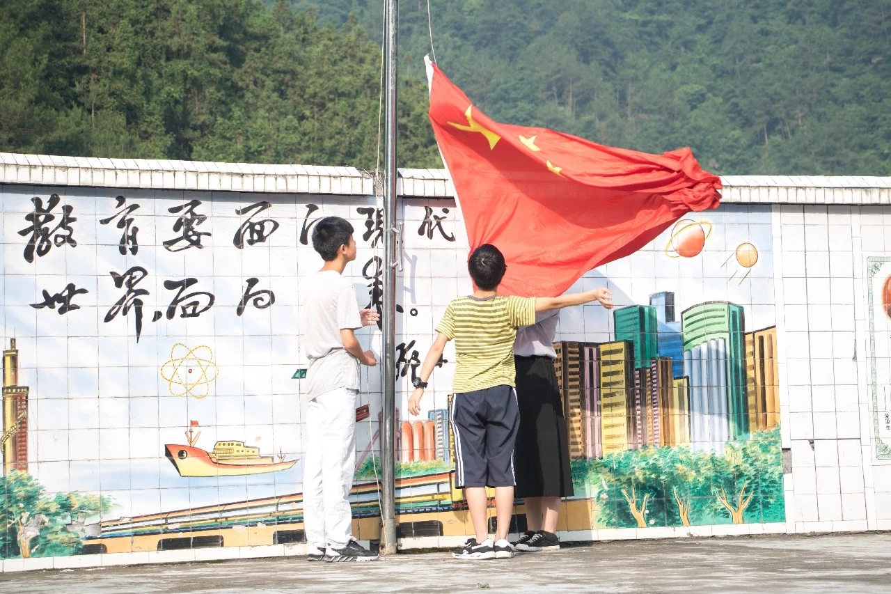 7月22日, 在水月镇中心学校操场,举行了一场庄严的升国旗仪式,阳光号列车暑期支教志愿者老师和参加暑期夏令营的全体同学参加。