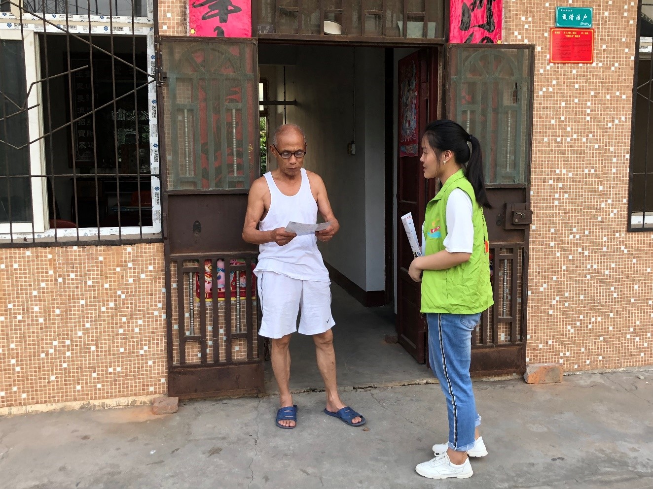 志愿者向村民分发环保宣传单并讲解环保小知识。志愿者 曹广涛 摄