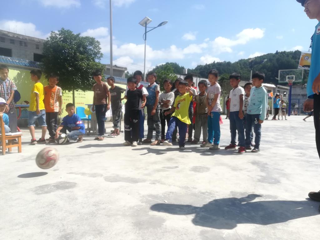 同学们神采奕奕,斗志昂扬,踢出的每一脚都力气十足,很多保龄球相继倒下。更有趣的是,保龄球是由支教队员在送路队的途中辛苦捡来的一个个矿泉水瓶装上水做成的。