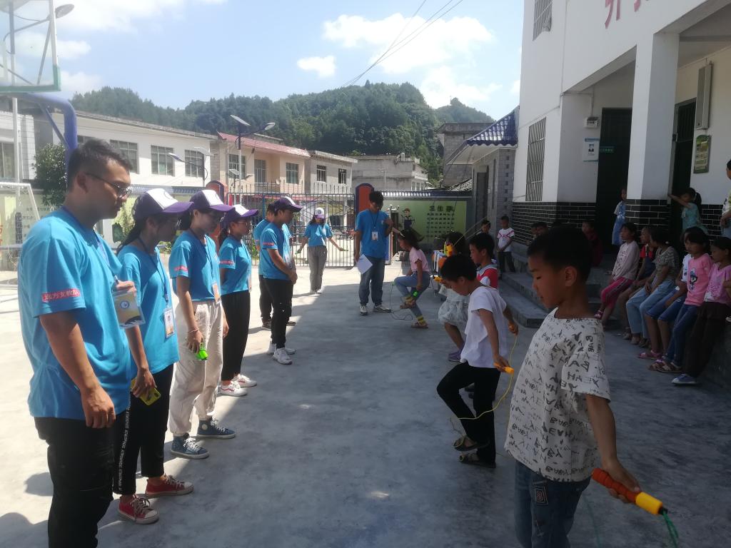 本次趣味运动会共有四个项目:跳绳、摸石头过河、足球保龄球以及原地拍球。每个项目由支教队员作为裁判,负责计时,计数和记录成绩。同学们兴致勃勃,精力十足,在趣味运动会中尽情地挥洒着青春的热血与激情。