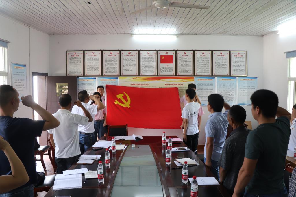上午9点半,会议正式开始。按照要求,全体同志面向党旗,集体重温入党誓词。该村党员缴纳党费,诵读党章。接着,实践团的四位同学应邀相继带领大家学习了习近平同志在“不忘初心,牢记使命”主题教育工作会上的讲话、宜昌市优秀党员陈骏和谭斌同志的优秀事迹以及习近平在中央政治局第十五次集体学习时强调全党必须不忘初心牢记使命把自我推向深入的讲话等材料。学习后,大家深切的感受到了习总书记对基层党组织的关怀与期望,同时也深深的被谭斌同志和陈骏同志的优秀事迹所感动,大家认为,一定要学习模范,坚守入党初心,牢记职责使命。