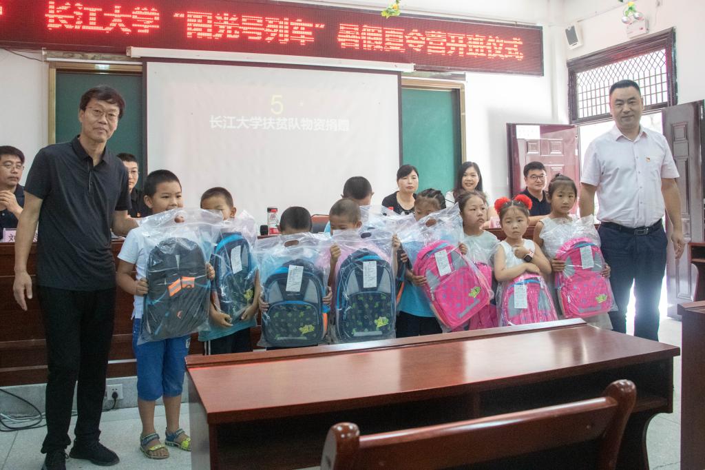 随后,工作队代表学校给水月寺镇中心学校捐赠了100个书包。罗学才和张卫东为学生代表发放书包。他们希望,孩子们度过一个开心快乐的暑期,充分感受到社会大家庭带来的温暖。
