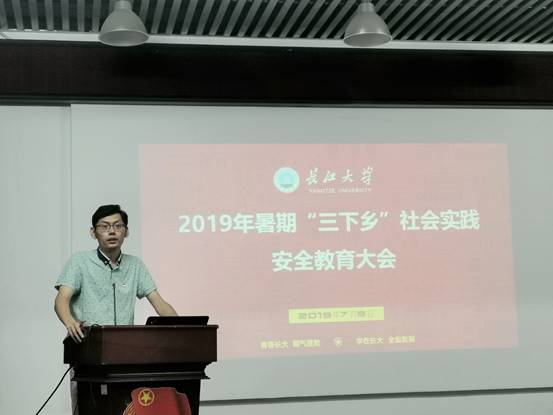 会议伊始,校团委科技与社会实践部信晓阳老师向与会人员介绍了我校历年来在“三下乡”暑期实践工作中取得的成绩,介绍了我校今年社会实践工作的总体情况,并就自然灾害防范、财产安全、实践工作安全、饮食安全、防溺水安全、交通安全、防滋扰等方面做专题培训,结合生动的案例,给在座的人员敲响警钟。同时他要求各团队要做好对各种突发事件的应急措施,并保证团队成员间能够随时联系、及时沟通,要严格落实每日安全事故零报告制度。切实保障参与社会实践活动学生人身、财产安全。