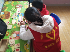 活动伊始,在医护人员协助下,由活动负责人依据志愿者自身特长,合理地将他们分配到大班、中班、小班、实验班、语言班以及衔接班,针对发声识字、辨别颜色、想象力等方向陪伴小朋友完成康复训练。志愿者们秉承奉献精神与孩子们共同进步,因孩子们各不相同的性格而灵活采用不同方式,耐心地一遍遍教孩子学唱“小星星”、“两只老虎”等儿歌,通过绘画简单图案、捏橡皮泥引导孩子尽情发挥想象力,教拼音教数字,练发声练算数,在走廊尽头处辨认五官,在互相陪伴中记住彼此。短短两个小时,志愿者们无时无刻不用自己的实际行动践行最美志愿者的责任,小朋友们不仅在语言表达上有了进步,也与志愿者们迅速建立依恋关系,对志愿者很是欢迎,个个喜笑颜开,却又不舍分别。