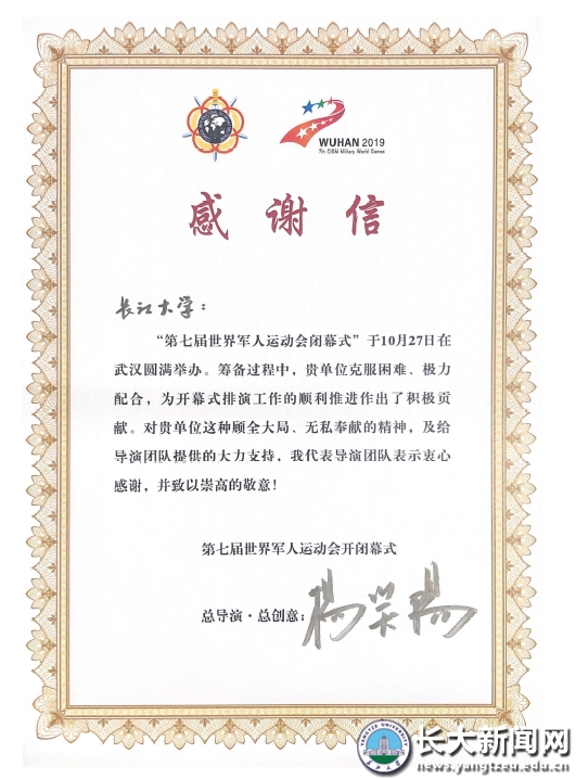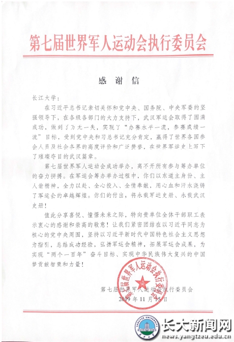新闻网讯(记者 晏亮)近日,学校收到第七届世界军人运动会执行委员会的感谢信,赞扬我校师生在本届军运会上所做出的积极贡献。信中提到:“在军运会筹办举办过程中,你们以东道主身份、主人翁精神,全力以赴、全心投入、全情奉献,用心血和汗水浇铸了军运会的卓越辉煌。你们的付出,将永载军运史册、永载武汉史册!”