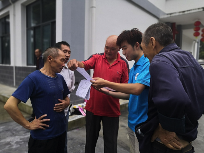 同学们将事先准备好的宣传单和调研手册分发给各位村民,为村民讲解法律常识和扫黑除恶知识,用通俗易懂的语言对于村民提出的疑问进行一一解答。