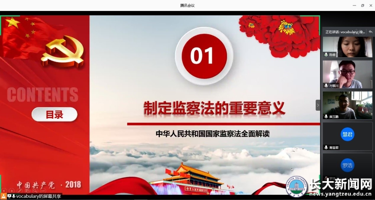 各学院组织召开线上主题班团会,通过微团课、线上课堂等方式深入学习《监察法》,并以相关内容展开研讨。1000多个团支部、3万余名青年学生线上参加学习并互动。