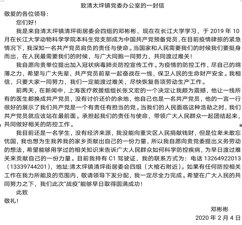 2月3日,清坪街社区防疫战斗队成立,这支由村“两委”、“尖刀班”、党员干部及志愿者组成的队伍开始了紧张有序的疫情防控工作。这下,邓彬彬再也坐不住了。在学校的他身上那股土家人的吃苦耐劳劲就怎么也甩不掉,学习专业之余还辅修了计算机科学的第二学位。学习上如此勤奋刻苦的他,思想上更是积极要求进步,于2019年10月成为一名光荣的中共预备党员。眼下正处于防疫的关键阶段,经过一个晚上的酝酿,第二天一早他就向清太坪镇党政办写了一封信,请求加入防控宣传,投身防控工作。信中,邓彬彬无比诚挚地写道:“我目前还是一名学生,没有经济来源,我没能向重灾区人民捐献钱财,但是位卑未敢忘忧国,我也想为生我养我的家乡贡献自己的一份力量!”