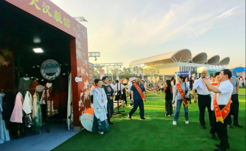 开幕式展演中,我校以汉服为主体,搭建“长大汉服馆”,以穿汉服、照汉服、展汉服等喜闻乐见的方式展示传统汉服文化,传承和发扬中华优秀传统文化。从开幕前演练到展示当天,各省份观演嘉宾、高校代表、兄弟院校师生、往届校友纷纷到“长大汉服馆”参观交流,试衣拍照,学行礼、共舞剑、传文化。