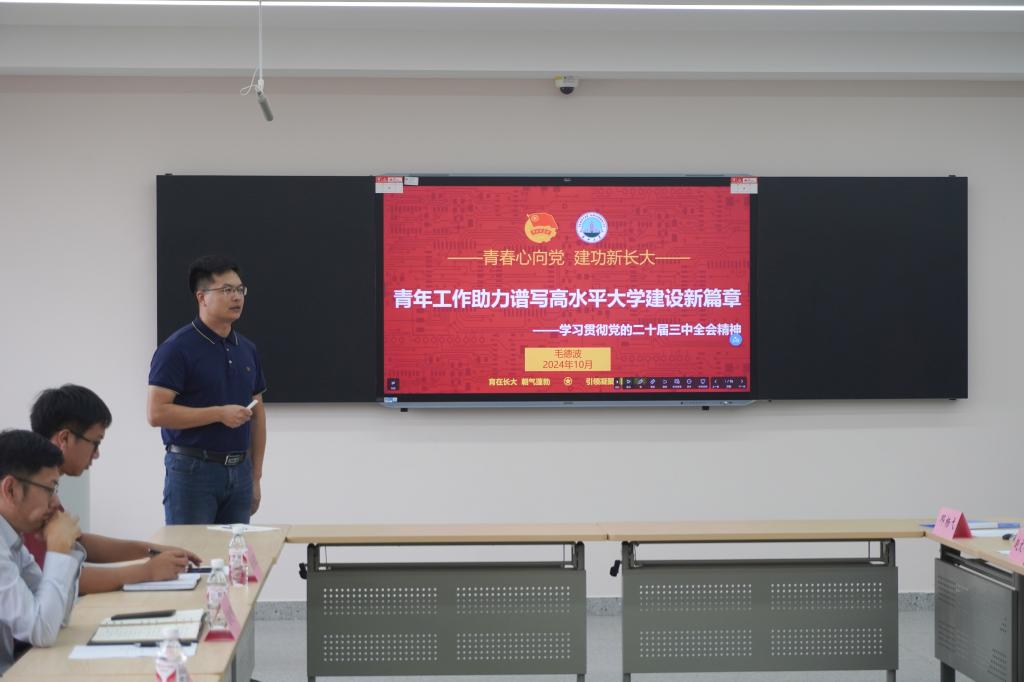 各组织指导老师现场就负责工作作简要发言。团委书记毛德波以“青年工作助力谱写高水平大学建设新篇章”为主题作党的二十届三中全会精神辅导报告,报告围绕全会的重大意义、总体要求展开,结合我校青年工作实际,毛德波依托三项扎实工作、三项创新举措、三项亮眼成绩,对共青团如何全面贯彻落实党的二十届三中全会精神作了详细解读。毛德波强调,学生骨干要认真领会党的二十届三中全会精神,围绕学校中心工作,在青年工作中以“有志气、有才气、有锐气,出思想、出特色、出实绩”的工作要求,不断提升学生干部的执行力,持续推进学生组织队伍建设高质量发展。