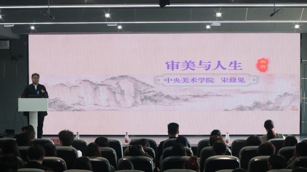 宋修见以习近平总书记给中央美术学院老教授的回信精神为切入点,引入中华美育的概念,深刻阐释了中华美育的深厚底蕴与独特魅力,并强调中华美育不仅仅是一种审美教育,更是一种心灵的滋养与品德的塑造。谈及人的发展,宋修见引经据典、深入浅出,启发在场师生深入思考审美与人生的深刻关系,以例证阐明了新时代美育对于塑造美好心灵、赋能美好生活的重要意义,辨析了中华美育传统和中华美育精神的丰富内涵,探讨了“以美育人”和“以美育己”的方法路径,解析了中华传统美育深植于诗书礼乐中的智慧与精髓。