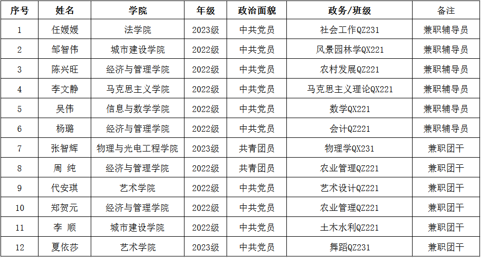 经个人报名、资格审查、笔试、面试答辩考核等环节,现将拟任校团委兼职辅导员、兼职团干人选情况予以公示。