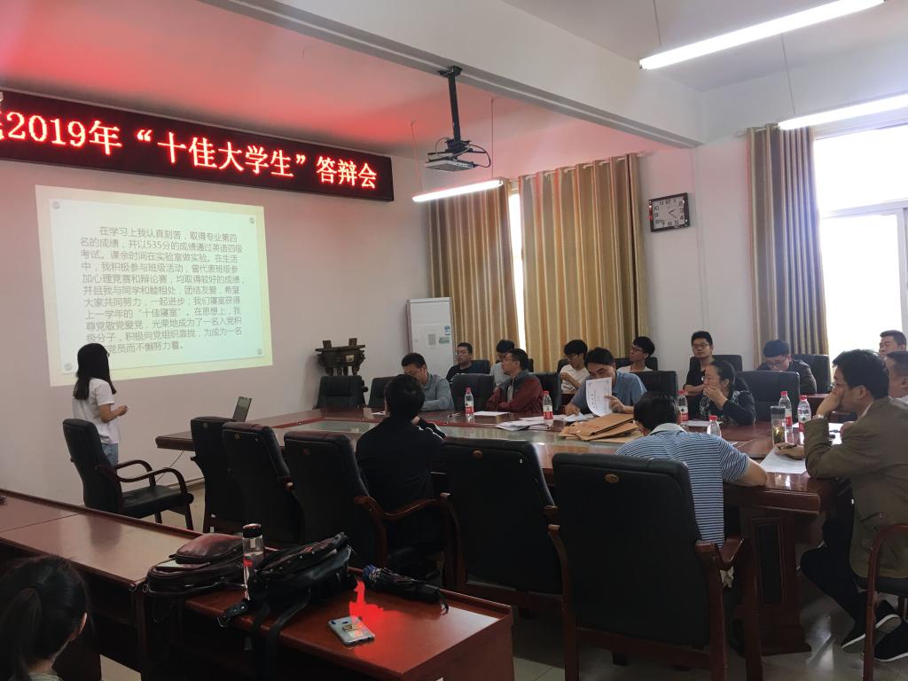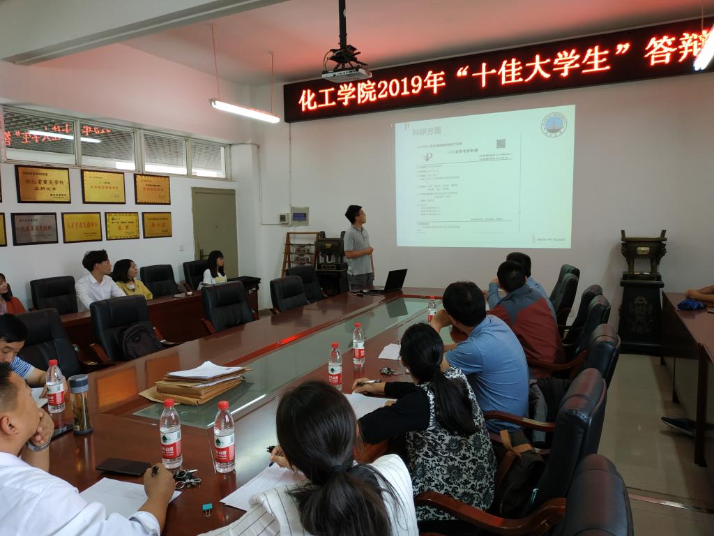 (通讯员郭先哲)为进一步加强我院大学生思想政治教育,充分展示我院大学生的精神风貌,树立大学生学习的楷模,发挥先进典型的示范作用。5月29日下午2:00整,我院2019年“十佳大学生”评选活动的答辩在14教西303会议室举行。化工学院党委副书记彭礼进、实验中心主任黄河、分团委书记严瑾、学工办主任刘敬敏、化学系主任吴爱斌、环工系主任魏平方、高材系主任米远祝、化工系主任石东坡老师受邀出席本次会议并担任评委。经过前期申报和初审,共有16名候选人参与最终角逐,他们根据抽签顺序依次上台。本次答辩主要包括自我展示和评委提问两个环节。