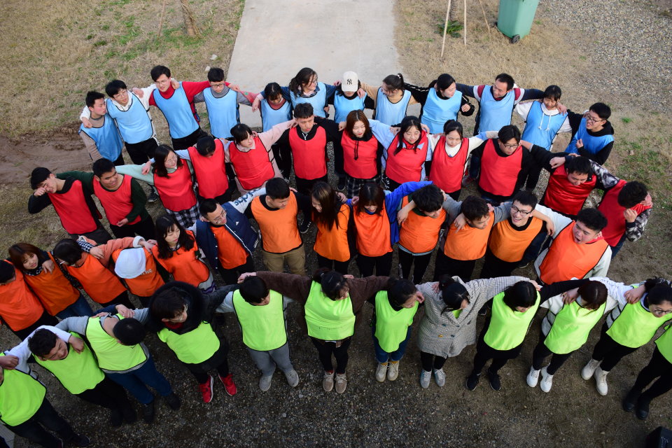 7点30分,同学们在学部团委书记曾盼老师和李小双老师的带领下到达千颂园文化园。正式训练开始之前,教练简要的对大家提出了各方面的要求,进行了行为训练并讲解素质拓展的意义。随后对所有人员进行重新分组,分发队服与队旗,开始了第一个项目:团队展示。在这一环节,每个队伍凝聚力量,发挥创意,取好队名、选好队歌、想好口号,摆出了各式造型,并在很短的时间里熟练的进行行为展示,所有同学都斗志昂扬。