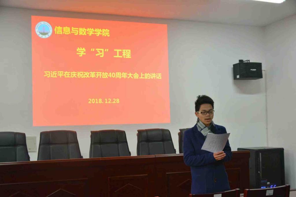 (通讯员 朱佐民)信息与数学学院于12月28日下午2:30在东校区八教406组织开展“习近平在庆祝改革开放40周年大会上的讲话”学习。全体党员及36名发展对象参会。会议由团委书记严星老师主持。
