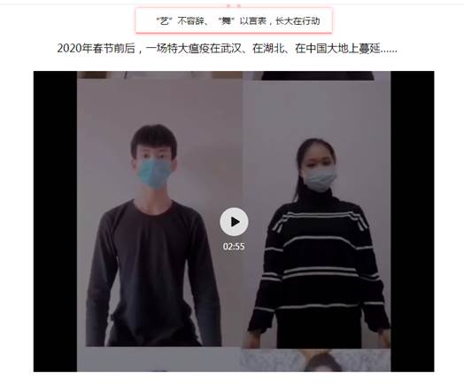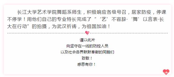 不仅如此,舞蹈系师生在工作和学习之余,主动作为,积极策划,齐心协力完成了“‘艺’不容辞·‘舞’以言表·长大在行动”的艺术片拍摄,以舞蹈的形式,向坚守在一线的防控人员以及社会各界默默奉献的同胞们致敬!