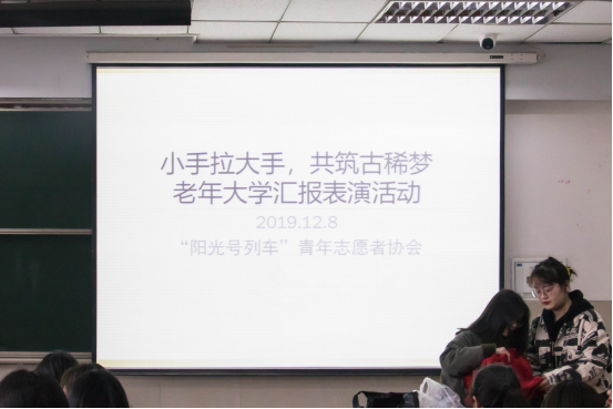 活动伊始,几个志愿者带来舞蹈《Adios》,音乐激昂向上,瞬间点燃了全场气氛。接着潘佳曦演唱歌曲《All of me》,悠扬的歌声沁入心扉,令人心旷神怡。接下来的独舞《Lalalaly》同样令大家拍手称好。舞蹈告一段落,阳光号列车全体成员合唱歌曲《七月上》,观众们都陶醉其中。志愿者唐智炜也为大家带来了《脸》,大家静静聆听着美妙的歌声。接下来,老年大学全体成员携志愿者合唱了歌曲《Take me home, Country roads,老人们和志愿者们共享其乐。最后一个节目是阳光号列车成员的弹唱《我相信》,我相信明天,我相信希望。相信阳光号列车,在志愿服务的路上,能够越走越远,越来越壮大,播撒阳光。