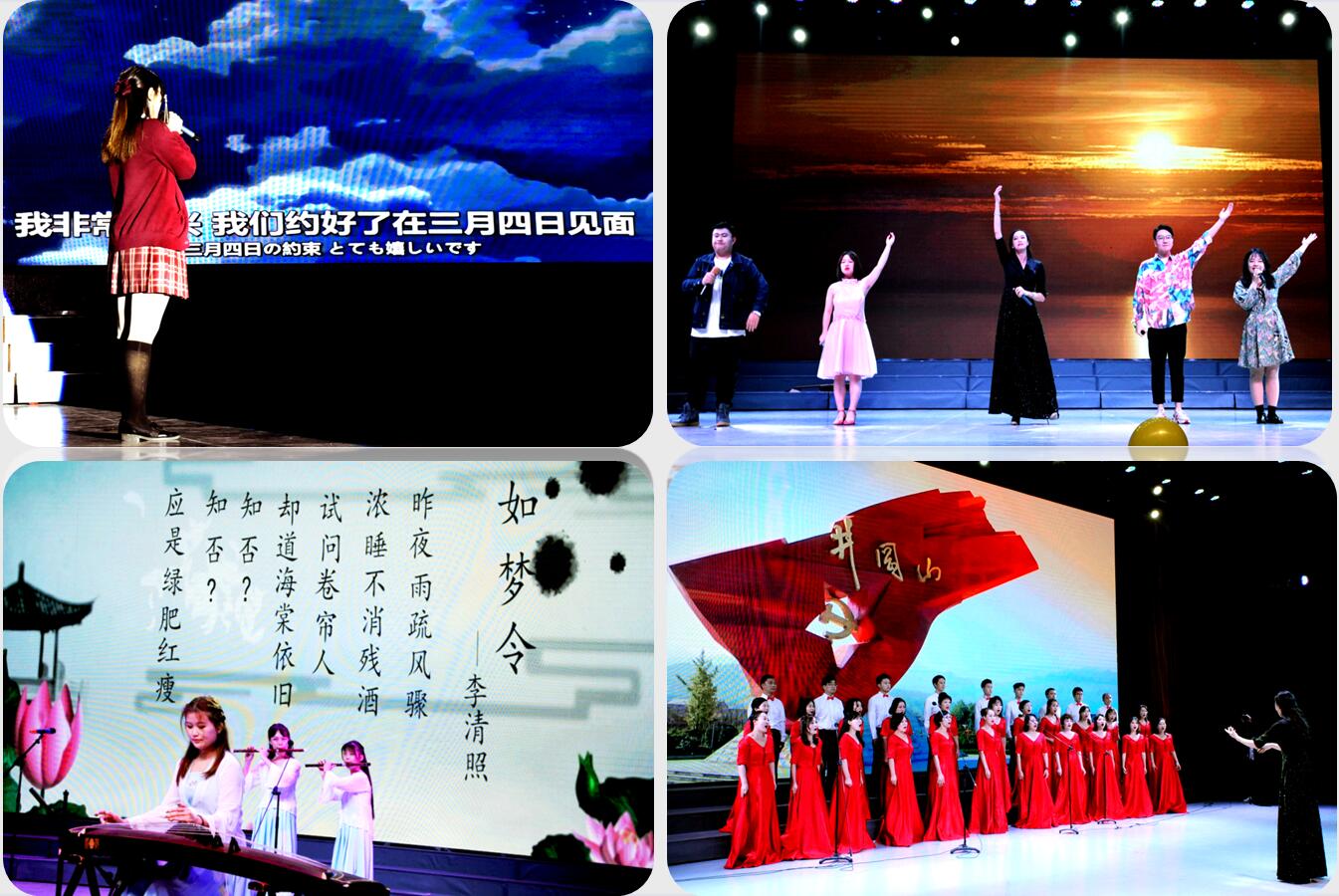 第三篇章“思潮奔涌,红色文化传承,初心使命正担肩”。“阳光号列车”志愿者们以原创的舞台剧《“国家宝藏”之玉覆面》为观众们讲述了一段楚国传奇故事,荆州博物馆的讲解员分别以中英并茂的解说,让大家了解了国宝“玉覆面”的故事,带领大家领略了博大精深的荆楚文化;翩翩伞影,古色古香,悸动旋律,扣人心弦,学生会的学生干部们带来的集体舞蹈《舞动风华》,让所有人深切地感受到阳光外院的活力无限;而悠扬的歌曲《飞云之下》,勾起多少天涯游子的思乡情怀;由学院教职工深情合唱的《我爱你,中国》,表达了学院师生对祖国母亲的深切热爱,将晚会带入到高潮。