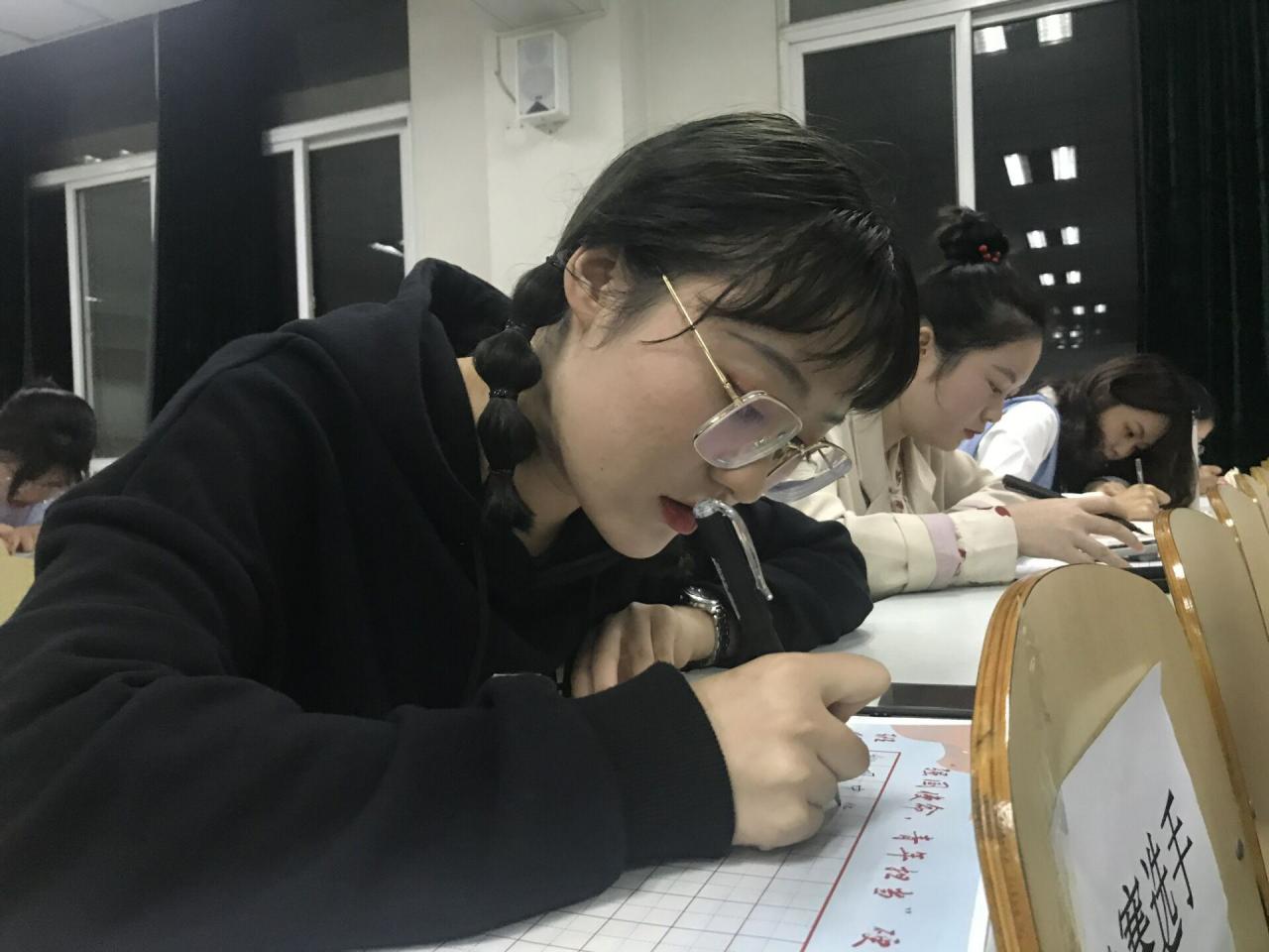 比赛开始,参赛选手在15分钟内书写与比赛主题相关的原创作品选段。与此同时,评委及观众观看硬笔书法教学视频,并进行书法常识、猜字谜等有奖竞答。书写完毕,各选手逐一对自己的书法作品从文学创作和书法艺术等角度进行综合解读,或叙述创作灵感,或解读作品内涵。选手的精彩解读既体现了同学们对书法艺术的掌握和喜爱,表达了青年大学生对新中国成立70周年的欣喜与自豪,更展现了青年学子对实现中华民族伟大复兴的中国梦的担当和使命。