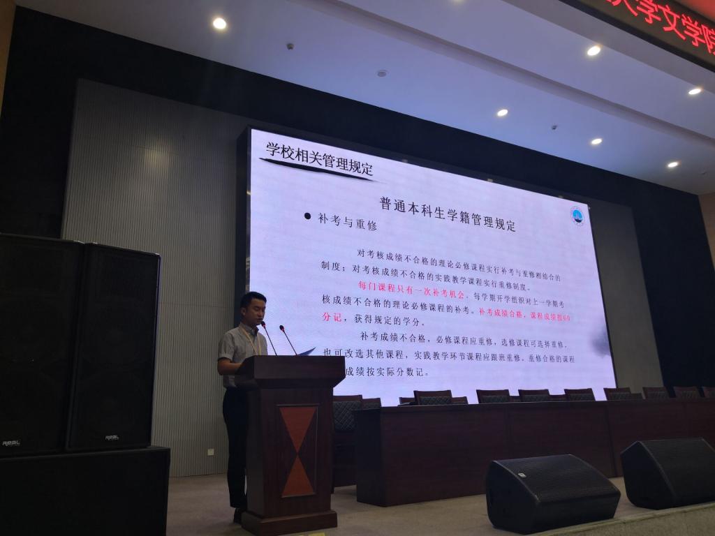 随后,文学院副院长余劲东向家长们介绍了学院概况、发展历程、办学条件、师资力量、科研实力及专业设置等情况。他勉励2019级新生尽快适应大学生活,以积极健康的心态来度过自己四年的大学时光,并结合自身学习经历,寄语2019级新生:目标明确、方法得当、持之以恒,就能梦想成真。