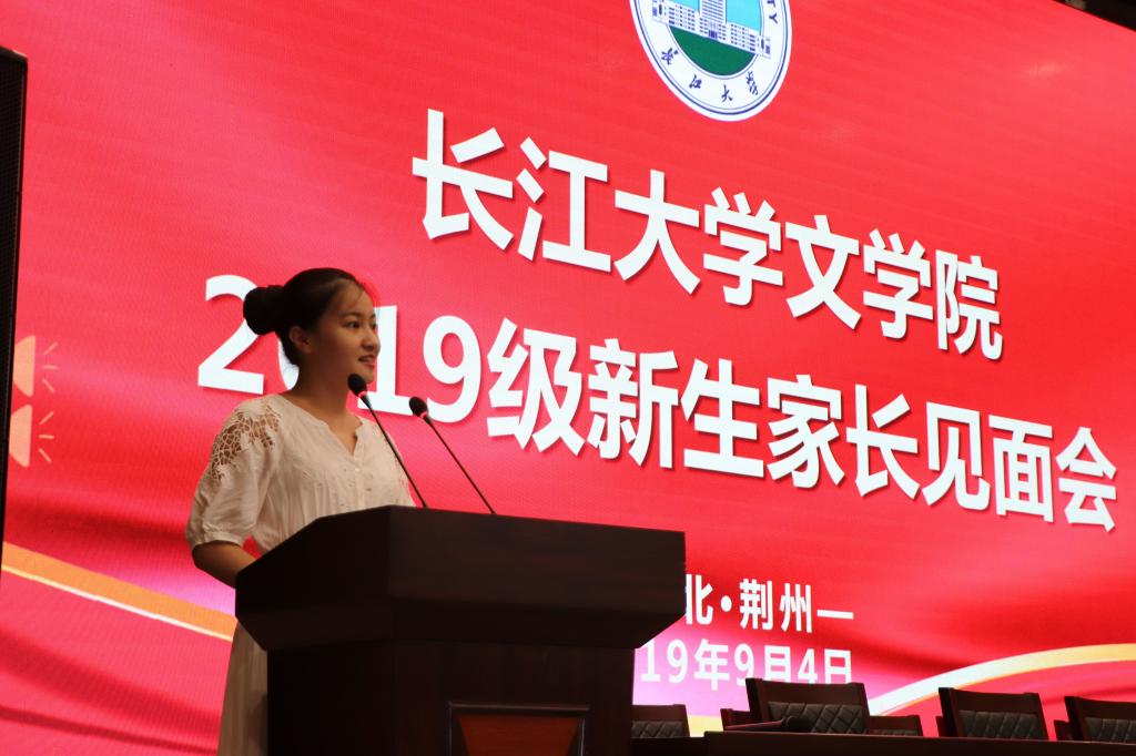 首先,文学院优秀学生代表张健芳表达了对2019级新生和家长们的欢迎,并分享了她与文院的故事。张健芳说道:育在长大,学在长大;育在长大,梦在长大。在大学里,学习是最为重要的事情,文学院是梦想起航的地方,每位学生都可以在这里发挥自己的个性,实现自己的梦想。