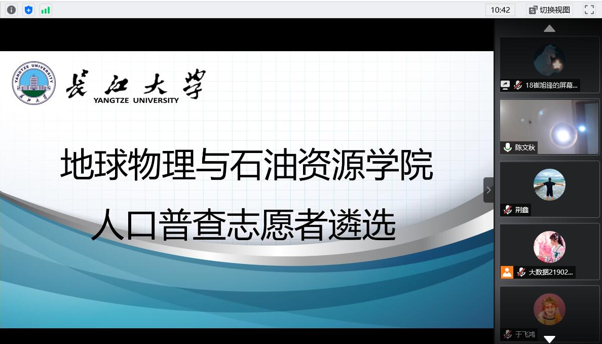 (通讯员/祁玉)根据国务院统一安排,2020年在全国开展第七次全国人口普查工作。大学生参与人口普查这一社会实践活动是广泛接触社会、增长见识、锻炼成才、服务社会的有效途径。武汉市蔡甸区人口普查办公室因工作需要,现面向武汉校区在校学生招募志愿者担任普查员。根据相关通知和安排,地物学院组织了志愿者招募活动,有100多人报名参加。为切实做好此次人口普查志愿者的招募选拔工作,8月9日,学院于线上组织进行了人口普查志愿者公开面试遴选。遴选结果将根据报名学生的面试表现,结合个人综合能力和平时表现来确定。荆鑫老师组织参与并主持了此次招募遴选工作。