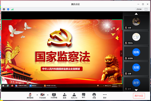学院积极响应学校“学习监察法,争做廉洁人”通知精神,将“学习监察法,争做廉洁人”作为6月主题班团会主要内容之一,宣传组织,落到实处。各毕业班团支部结合自身实际情况精心策划并做好前期筹备,积极开展了此次活动。活动主要围绕三个方面展开:一是微团课、线上课堂环节,组织学生观看《学习监察法,争做廉洁人》专家视频讲座、监察法知识在线学习,对“学习监察法,争做廉洁人”主题进行了深入了解和自我学习;二是各支部开展主题班团会,讲解《2018版中华人民共和国监察法学习解读》,深入学习监察法的重要意义、起草过程、指导思想、基本思路、主要内容等;三是督促学生完成《中华人民共和国监察法》知识测试环节,对监察法知识进行回顾与巩固。全体毕业生参与度高,学有所获。