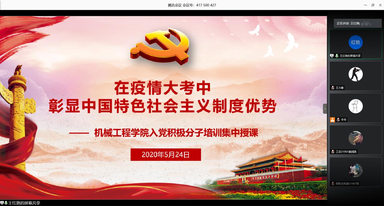 524日晚7时,机械工程学院开展入党积极分子培训集中授课,88名入党积极分子参加培训,此次培训由学院分党委书记王红艳讲授,主题为《在疫情大考中彰显中国特色社会主义制度优势》,学生党支部书记、辅导员刘冬冬老师主持并全程参与学习。