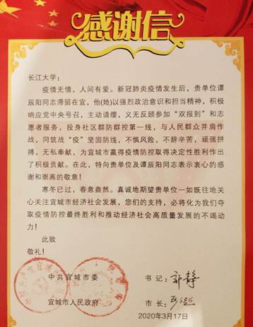 据悉,学校还收到了中共宜城市委和宜城市人民政府写的感谢信,信中高度赞扬了谭辰阳的政治意识和担当精神。谭辰阳同志严格要求自己,向优秀党员看齐,用实际行动向居民传递着温暖,用无私奉献诠释着一名新时代青年的责任与担当!