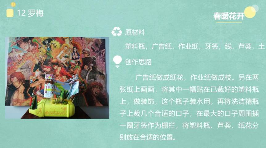 本次活动共有参赛作品21个,选手们按照顺序依次对自己的作品进行展示,并伴以精彩讲解。从实用性、美观性、创新性三个角度出发,作品都体现了设计者的创新思想和环保理念,作品均是利用废旧品设计,变废为宝,选材适宜,符合绿色环保概念,所有创意项目都令评委们耳目一新。其中,12号志愿者罗梅的作品令人惊叹:花和芦荟代表着春天来临,万物复苏,预示着一切美好事物即将来临,栅栏为界,保护着芦荟,恰如疫情期间最美的“逆行着”——全国各地奋战在一线医务人员,保护着每一位民众。