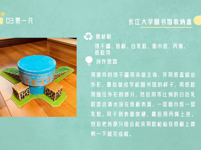 4号选手贾一凡的作品也令人眼前一亮。她利用饼干罐等材料制作出了以韦德体育bevictor图书馆为模板的收纳盒。俯视图看上去像是一本展开的书,兼具美观与实用两大功能,同时呈现出了满满的设计感。