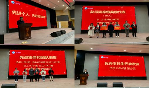 大会伊始,主持人对2020级法学院新生到来表示欢迎,随后向参会人员介绍在场嘉宾。接下来进行的表彰环节中,分别对上一年度优秀学生代表,国家奖学金获得者,各项比赛获奖者及考研与法考明星获奖者进行表彰。并由法学院领导颁发证书。最后,主持人表达了对获奖同学们的祝贺,也对他们的未来寄予了期待。学生代表张亦美建议同学们保持健康心态,制定明确的学习目标;卢文博倡议同学们吃苦耐劳,把理论知识运用到建设国家社会的实践中去;陈雪莹把打好知识基础,不断追求卓越作为对同学们的期盼;周文双要求同学们饱含对未来的期待,立志将人生理想与国家命运紧密相连;徐莹从生活各方面叮嘱起居事项,充满关爱。最后,法学院院长李华成介绍学院情况和平台,提醒同学们努力学习、不断提升自己。