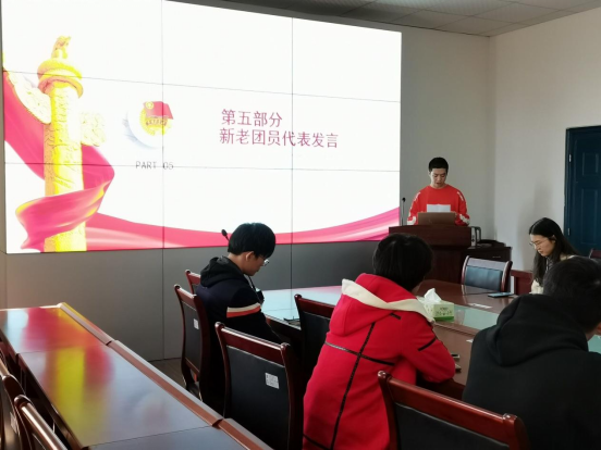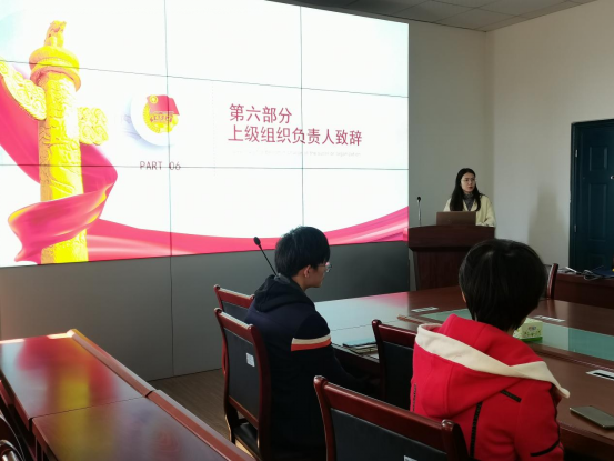 会议的最后,张茜作为上级团组织代表带来致辞。她首先对十四名新成员们表示祝贺和欢迎,并对他们做出了三点要求。一是希望他们能积极参与团委组织开展的活动,密切配合自己所在支部的工作开展;二是能牢记入团誓词,切实履行团员义务,努力成为一名优秀的共青团员。三是能全面发展,努力学习,在同学中起表率作用,尽心尽力为班级、为学校做出贡献,不断挑战自我,超越自我,争取早日成为一名光荣的共产党员。致辞结束后,会议在宏亮的团歌中圆满的落下帷幕。