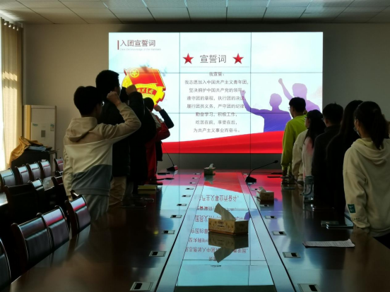 会议伊始,全体师生起立,共同奏唱国歌。紧接着,何嘉仪宣读了2021年新发展团员名单,本次共有十四名同学光荣加入中国共青团。随后,老团员代表许雨青为新入团的成员们颁发团员证。在主持人的带领下,十四名新成员在鲜艳的团旗下庄严宣誓,铿锵有力的宣誓声在教室中回荡。他们将握拳的右手举起过肩,声音洪亮,深情而庄重。