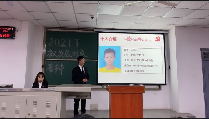 (通讯员 陈星雨 江雨龙)2021年10月7日晚7点,为进一步严格发展党员程序,强化入党教育、考察和监督环节,增强党员发展工作的透明度和公开性,选拔高素质学生党员,石油工程学院第一党支部于B教106举行拟发展对象答辩大会。本次会议由康汉博同志主持,本科生第一党支部书记商麟鑫同志及学生党员参与会议。