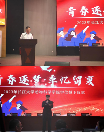 (通讯员:王春花 陈婧卓|摄影:谭丽杨 来春玲)仲夏之时,凤凰花开。6月5日晚韦德体育bevictor动物科学学院265名毕业生相聚在农科大楼1058,进行2023年毕业典礼暨学位授予仪式。出席本次典礼的有:校团委副书记信晓阳、组宣部部长张鑫、2009届优秀校友正大集团中南区食品事业副总裁秦浩曦、2010届优秀校友正大食品销售经理黄国强,学院教师有常务副院长高学军、副院长杨烨、副院长许巧情、周玉教授、杨彩侠教授、阮国良教授、袁汉文教授,教师代表田光明、郜卫华、黄廷华、李伟国以及辅导员杨湘虹、王海洋。会议由学院党委副书记孙恺主持。