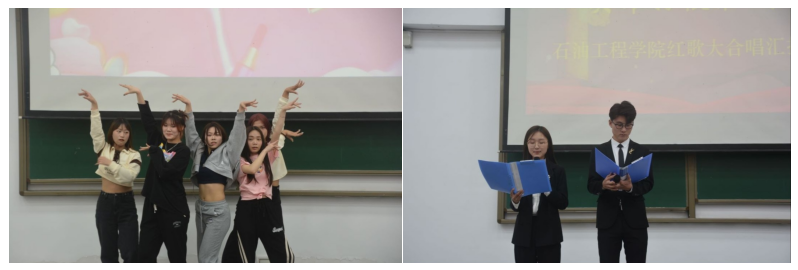 比赛表演曲目有《我为祖国献石油》、《石油工人之歌》、《江汉石油之歌》。赛前,参赛班级摩拳擦掌、气宇轩昂,他们蓬勃的气势,展现了石油人不怕苦不怕累,要为祖国能源事业添砖加瓦的决心。中场游戏“猜歌名”环节,一首首经典歌曲顿时使现场热度达到高潮,在场的同学们踊跃抢答,拿到了丰厚的奖品。