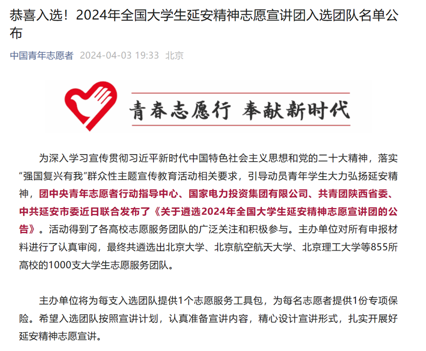 此项活动是由团中央青年志愿者行动指导中心、国家电力投资集团有限公司、共青团陕西省委和中共延安市委联合开展。全国大学生延安精神志愿宣讲团是首批全国大学生弘扬中国共产党人精神谱系志愿宣讲团组成之一,旨在深入学习宣传贯彻习近平新时代中国特色社会主义思想和党的二十大精神,落实“强国复兴有我”群众性主题宣传教育活动相关要求,引导动员青年学生围绕以“坚定正确的政治方向,解放思想、实事求是的思想路线,全心全意为人民服务的根本宗旨,自力更生、艰苦奋斗的创业精神”为核心内容的延安精神开展深入学习和宣讲,大力弘扬延安精神。
