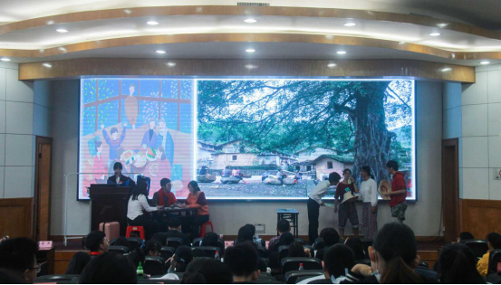 接下来,是由晟睿一组和碧岑六组带来的“经济·教育·意念——请您听我讲脱贫”的主题表演。节目最开始以沙画视频展示了我国经济社会改革开放之后的变化,以一家人吃年夜饭为背景,展现了中国经济的高速发展、老一辈支教的坚守和新一代外出打拼的不易。节目内容和立意贴近生活,在场的观众感同身受,不禁动容。