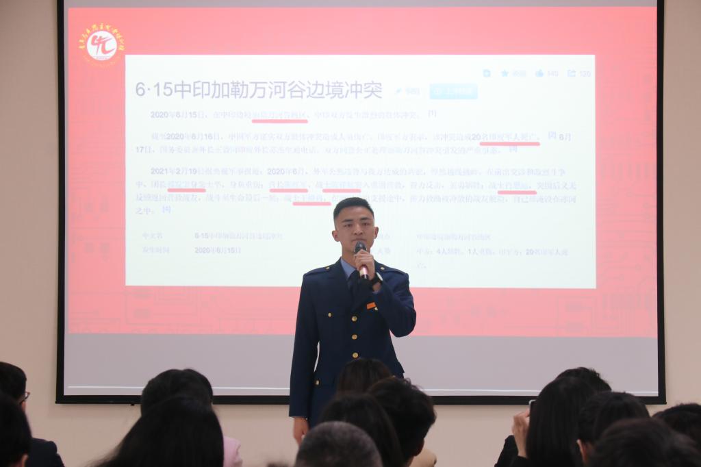 百年正值风华,吾辈更需奋进。王伟同学结合自身军人的使命与担当,讲述着这个时代最可爱的人的故事。他感慨抗美援朝空军的英勇无畏,崇拜戍边战士的保家卫国。他说:“人民解放军永远是党最忠诚的卫士,永远是中国人民的子弟兵,永远是实现中华民族伟大复兴的坚强后盾,也永远是我们这个新时代最可爱的人!”执榜样之笔,书青年华章。杨睿同学通过讲述张桂梅和章海晨两位榜样的故事,结合自身,她说:“我们没有感天动地的故事,被身边的榜样不断激励着。终有一天,我们也会成为别人的榜样,接下时代之笔,书写下独属于我们,独属于中国青年的青春华章!”时代英雄,一直都在。姚苏玲同学回顾了1955年无数先辈为祖国事业鞠躬尽瘁,在国家处于危难时刻时,义无反顾的冲在前阵的历史。她以扶贫干部张渠伟为例,讲述了扶贫工作者克服万难,只为群众脱贫的感人事迹。她说:“强大的中国已经屹立在世界东方。作为新时代的大学生,我们理应承担起建设祖国的重任。”