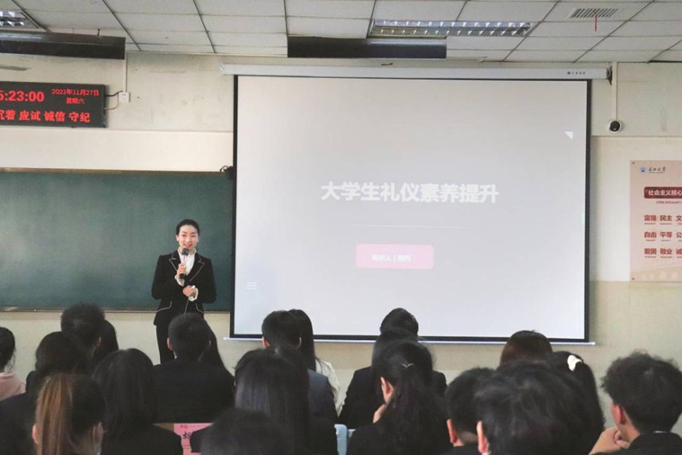 而后,阳丹老师分享了校园着装和仪容规范,详细讲解了首饰佩戴讲究“符合身份、以少为佳、同质同色、符合习俗”四个原则。在讲述仪态礼仪时,阳丹老师邀请同学上台实践、示范,从坐姿、站姿、走姿分别进行细致的点评和讲解。谈到“微笑礼仪”时,阳丹老师表示微笑的表示方式多样,除了面部微笑外,口部、眼部、声音、心里等都可以表达微笑。在聊到“社交会面礼仪”时,阳丹老师从目光柔和、问候礼节、称呼礼节三个方面进行阐释,幽默的语言配合上生动的例子,整个课堂显得非常活跃。