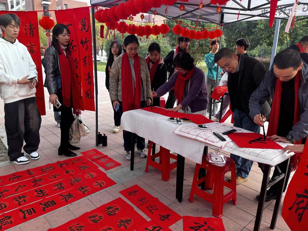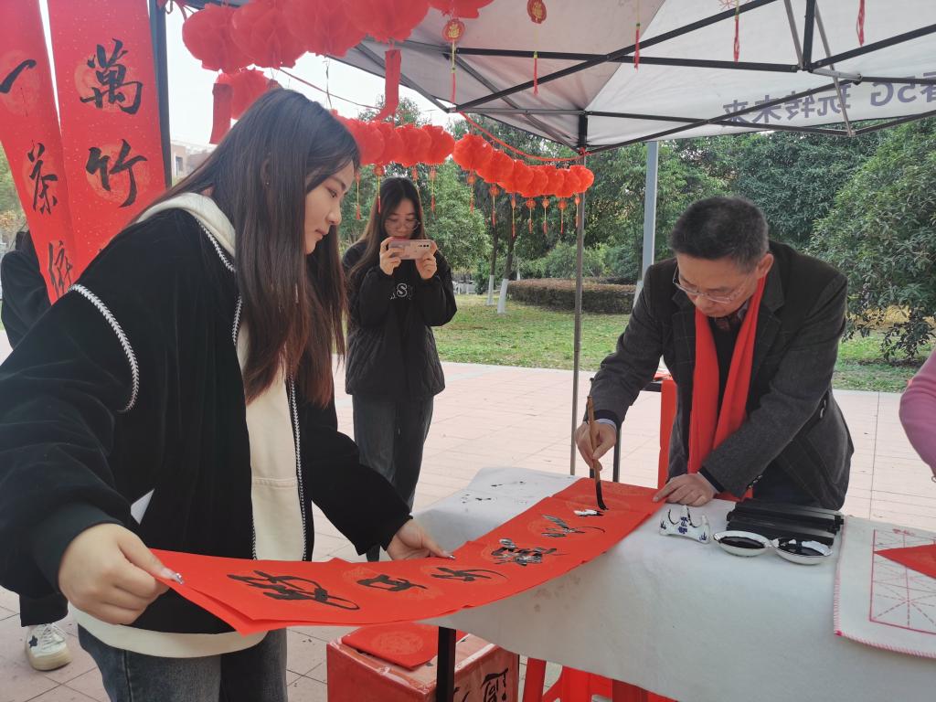 市诗联学会、电信天翼书法协会、朱道卫名家工作室的知名艺术家,利用业余时间为活动创作了精彩的成品对联近200副,不少名家兴致盎然书写春联作品,并互赠互送,现场累计面向全校师生员工送出春联近700副、福字近700个、灯笼400余个。活动现场一派热闹气氛,师生纷纷为此活动点赞称快。