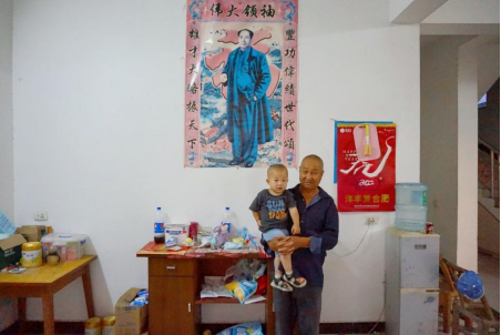 图为赵大爷与其曾孙子合影 墙上毛主席是赵大爷于十多年前张贴 (马金伶 摄)