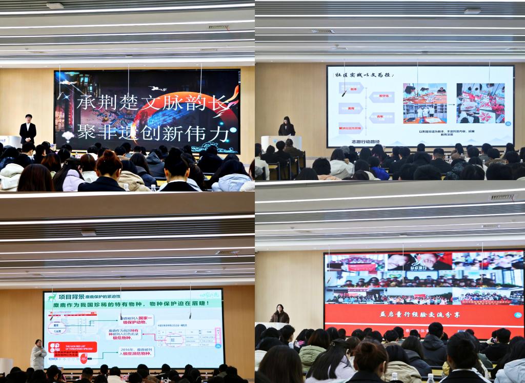 在进行社会实践与志愿服务事迹分享的环节中,来自“益启童行”团队的支教团成员周子睿,详细介绍了支教团的组织架构、特色活动、项目申报流程以及所获得的荣誉经验。“长青艺梦”团队的成员孙懿舒,则以“非遗文化+托管”的创新模式,叙述了“七彩假期”项目如何依托荆楚地区的非物质文化遗产,丰富了暑期托管的内容。物流专业的薛诗宸同学以地方花鼓戏为例通过“实践+创新+科研”的形式展示了团队寒假期间“返家乡”社会实践活动的成果。“生声不息”实践团的殷煜斐同学以“回家的‘鹿’”为题,分享了他们作为长江中游麋鹿保护引领者对长江中游地区野生麋鹿的生境科学研究以及种群动态监测的深入研究。