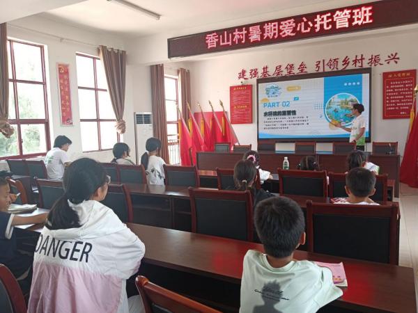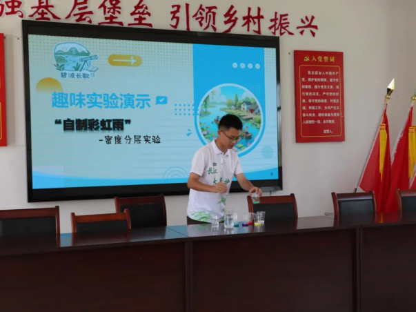 7月10日的香山村村委会热闹非凡,这里的爱心托管班成了“科学魔术秀”的现场。钟鱼佳、梁柳玉化身“魔术师”,带领孩子们做起“彩虹雨”实验。当食用油、清水和食用色素在试管中形成绚丽的分层效果时,孩子们发出阵阵惊呼。“这个实验告诉我们,污染物会影响水质。”梁柳玉趁机讲解环保知识,让护水理念在趣味互动中生根发芽。