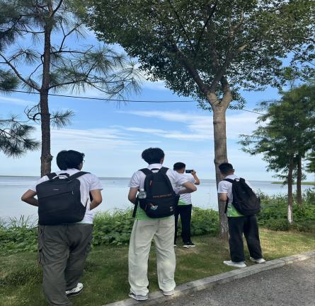 7月8日清晨,队员们登上前往洪湖市螺山镇的大巴。四个小时的车程里,大家趴在座位上整理问卷数据,讨论着接下来的实地考察方案。抵达螺山泵站后,队员们沿着江边一路前行,仔细观察水质、记录沿岸企业设施。“你们看,水面没有垃圾,也没有异味。”孙志聪兴奋地喊道,用pH试纸检测水质,试纸呈现的中性颜色让大家备受鼓舞。沿着3公里湖岸线,队员们设置了15个观察点,详细记录水生植被覆盖情况,汗水浸透了队服,却没人停下脚步。